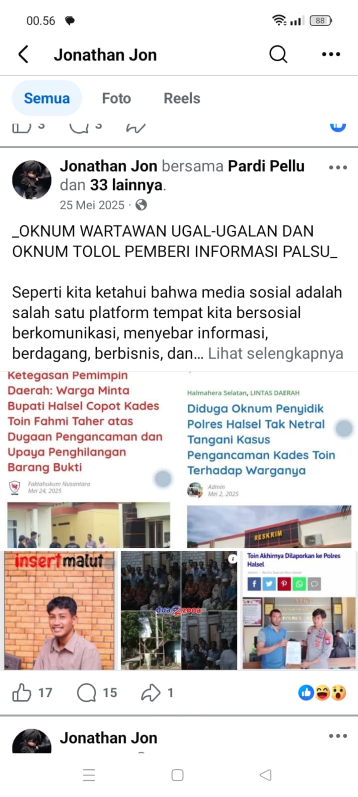 HALSEL,Coretansatu.com — Misteri akun Facebook bernama Jhonatan Jon yang selama ini meneror warga Desa Toin serta sejumlah wartawan di Kabupaten Halmahera Selatan akhirnya mulai terkuak. Berdasarkan penelusuran media ini, akun yang kerap menyebar ujaran kasar dan intimidatif tersebut diduga kuat dikendalikan oleh Sekretaris Desa Toin yakni Salatudin Abdul Manaf.